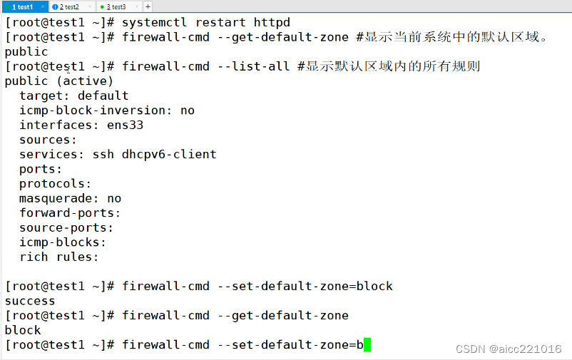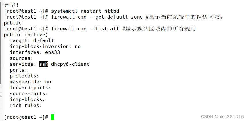 - Public 公共区域,允许ssh或者dhcpv6-client的流量可以传入,其他的全部拒绝,也是firewalld的默认区域