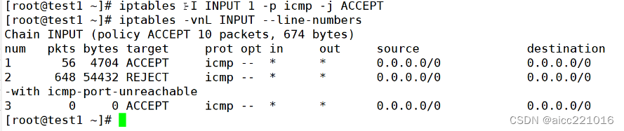 -I指定插入INPUT链 1:编号 -p:指定协议 -j指定控制类型