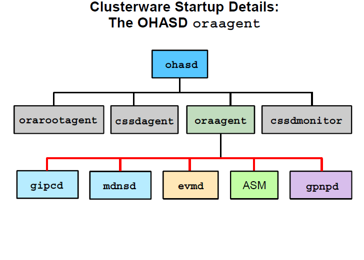 The Oracle High Availability Services daemon (ohasd) is responsible for starting in proper order, monitoring, and restarting other local Oracle daemons including the crds daemon, which manages clusterwide resources. When init starts ohasd on Clusterware startup, ohasd starts orarootagent,cssdagent, and oraagent. Some of the high availability daemons will be running under the root user with real-time priority, and others will be running under the Clusterware owner with user-mode priorities after they are started. When a command is used to stop Oracle Clusterware, the daemons will be stopped, but the ohasd process will remain running.