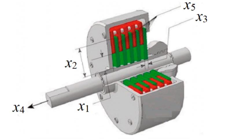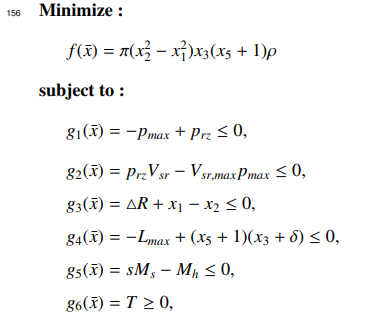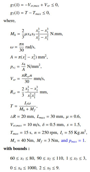 这个问题的主要目的是使多片式离合器制动器的质量最小化。在这个问题中,使用了五个整数决策变量,它们是内半径(x1)、外半径(x2)、盘厚度(x3)、致动器的力(x4)和摩擦表面的数量(x5)。这个问题包含九个非线性约束。问题可以定义如下: