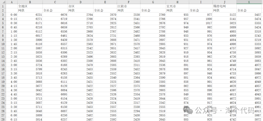 该数据集是每15分钟进行一次采样,每个样本都包含全地区的负荷值和江阴市、宜兴市、以及锡澄电网在网供和全社会的负荷值。