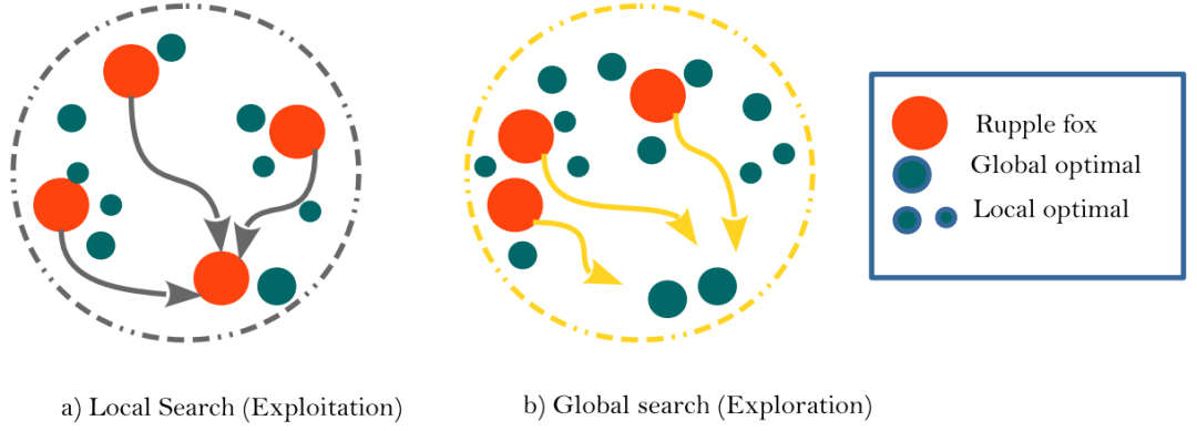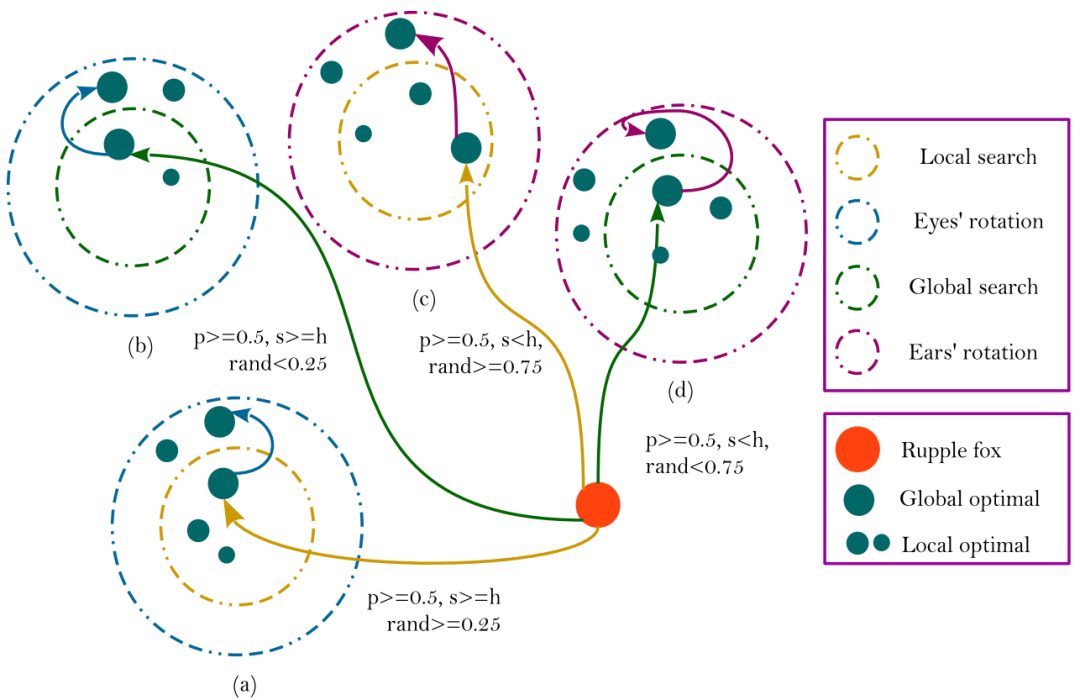吕佩尔狐大部分时间都在寻找潜在猎物,猎物可能是最优的也可能是不利的,因此它们的位置不断变化。当它们听到、看到或嗅到猎物气味时,通常会朝向猎物移动。在此过程中,保留当前最优位置,并根据该最优位置更新其他吕佩尔狐的位置。在某些情况下,吕佩尔狐可能会直接移动到猎物位置,或者猎物会离开该区域继续觅食。此时,吕佩尔狐会继续在该区域内徘徊搜寻猎物,利用听觉和视觉进行追踪。