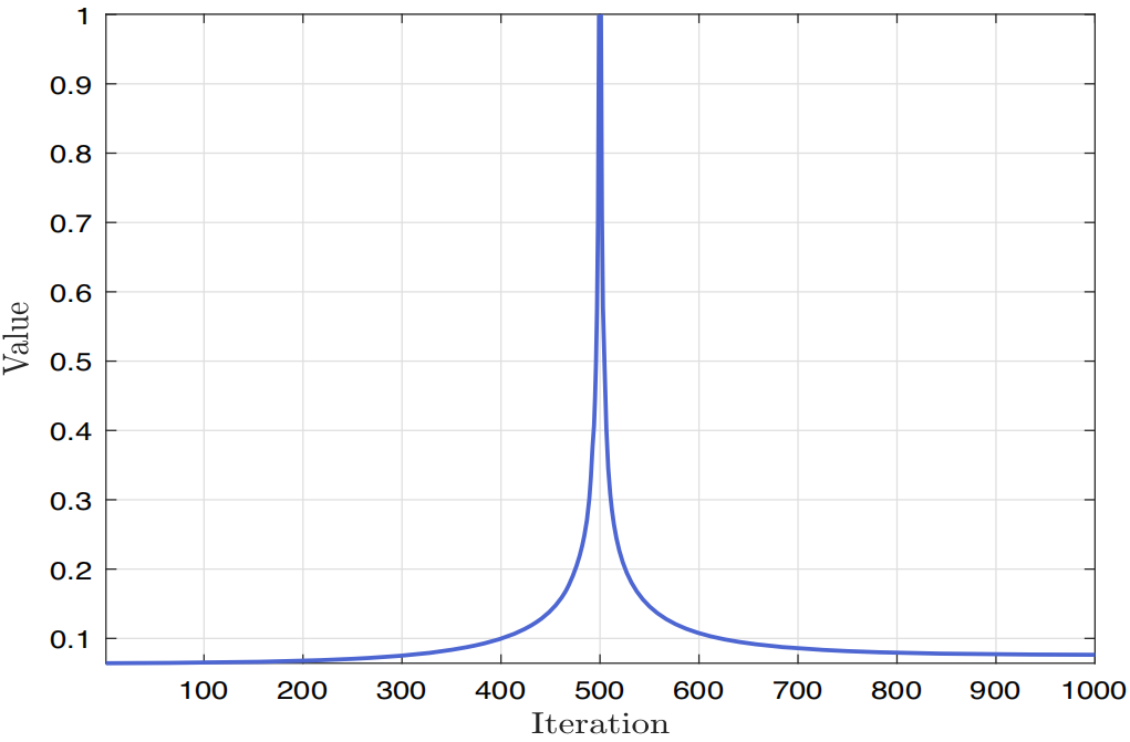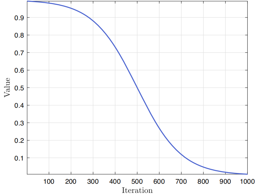 其中,参数 隐式体现了吕佩尔狐的听觉能力,该能力随着迭代次数的增加而减弱,模拟狐狸在逐渐接近猎物时听觉敏感度的变化。该函数随迭代过程的变化如下图所示。