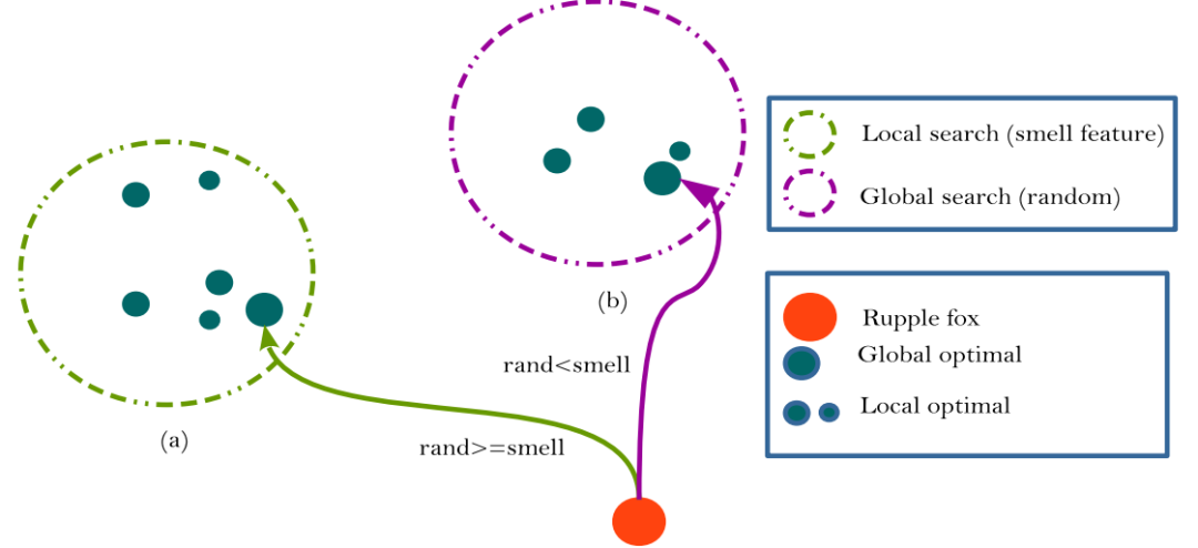 除了敏锐的听觉和视觉外,吕佩尔狐还具备出色的嗅觉能力,能够在昼夜间通过嗅觉搜索猎物,从而实现在搜索空间内的全域感知与探索。当吕佩尔狐逐渐接近猎物时,其嗅觉敏感度会呈指数级增强,直到精确定位到猎物的可能位置;相反,当其逐渐远离猎物时,嗅觉信号则呈指数衰减,直到意识到已偏离了猎物所在区域。在此类情况下,吕佩尔狐仍需在不同方向和区域内随机搜寻猎物。该行为可通过公式进行数学建模: