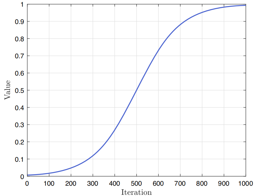 s=1/(1+exp((itemax/2 - ite)/L)) ; % % hear increasing (daylight) 0--1 (up to night)