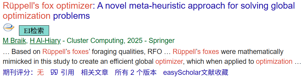 [1] Braik M, Al-Hiary H. Rüppell’s fox optimizer: A novel meta-heuristic approach for solving global optimization problems[J]. Cluster Computing, 2025, 28(5): 1-77.