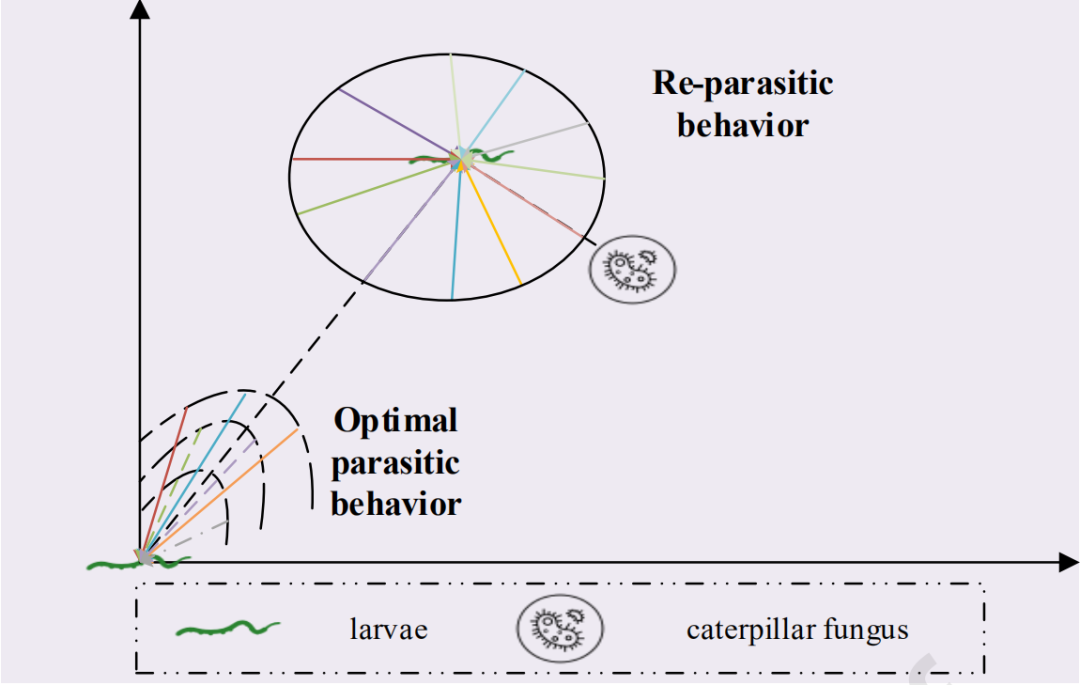 虫草展现出在最优寄生与再寄生之间的策略选择,如下图所示。该选择性寄生行为的数学建模,有助于提升虫草优化算法(CFO)向更高寄生成功率的收敛能力。此方法结合了全局搜索特征的再寄生行为和局部搜索特征的最优寄生行为。这种双重策略显著增强了所提 CFO 的搜索效率,促进了对搜索空间的更全面探索与利用。
