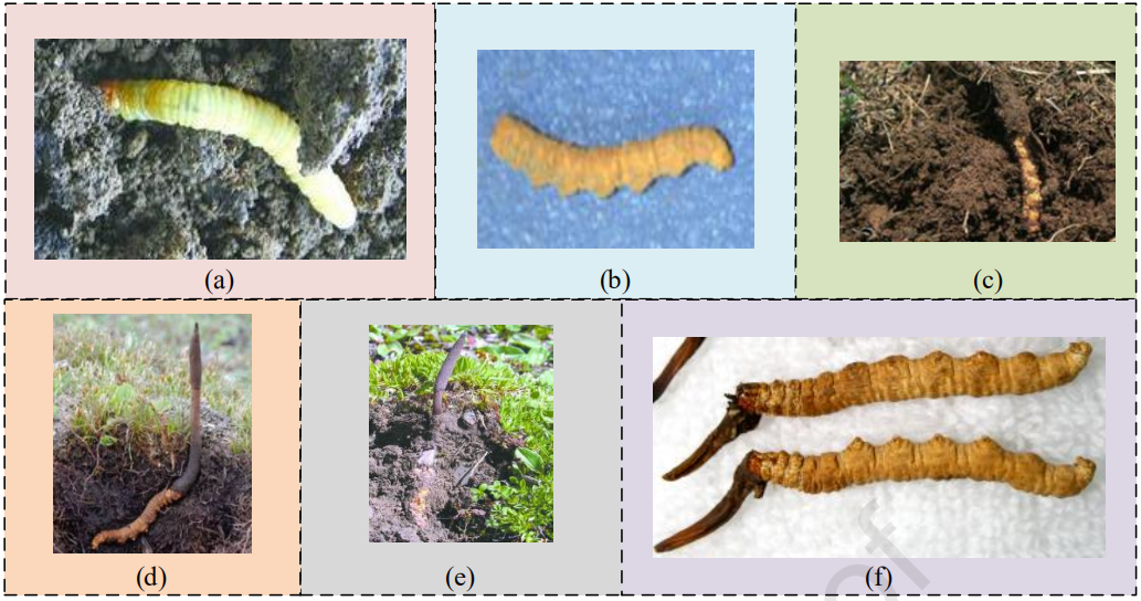 冬虫夏草独特的形态结构来源于其对蝙蝠蛾属(Hepialus)幼虫的寄生行为。一般来说,蝙蝠蛾的一生经历卵期、幼虫期、蛹期和成虫期。图 (a) 展示了虫草在蝙蝠蛾处于蛹期时的寄生过程。