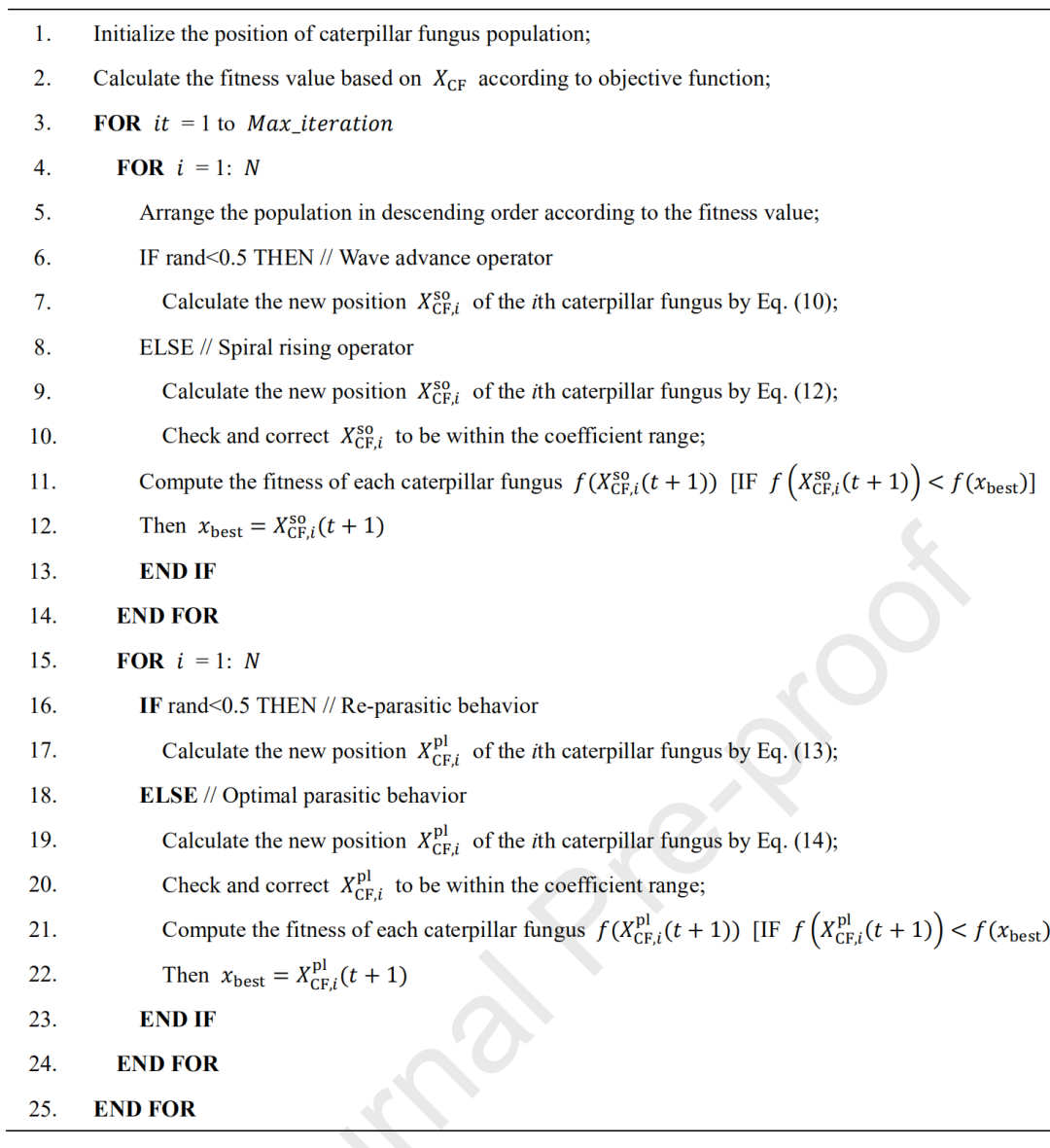 其中,𝑟7 是在 [0,1] 区间内均匀分布的随机数;𝜆 表示虫草在迭代初期具有较大的搜索步长,而在迭代后期搜索步长逐渐减小。此外,随着迭代次数接近最大值,参数 𝜆 逐渐趋近于零。该渐进式调整由搜索步长参数控制,使得算法能够从大范围探索平滑过渡到更精细的小范围开发。通过这一自适应策略,所提虫草优化算法(CFO)得以不断优化搜索轨迹,持续收敛至全局最优解。