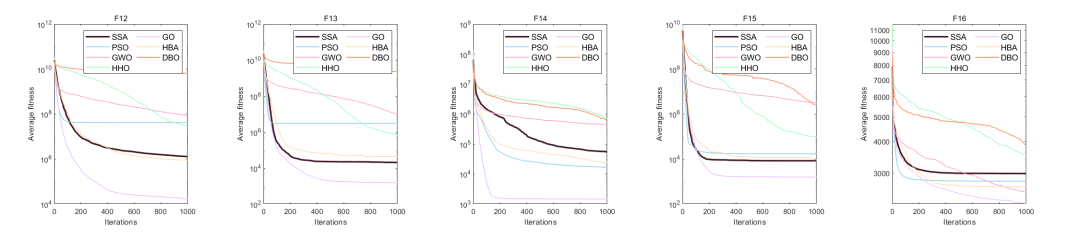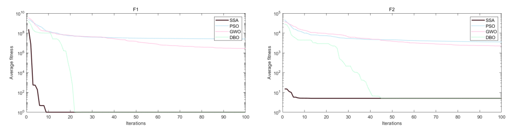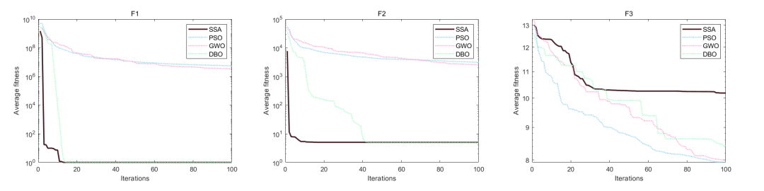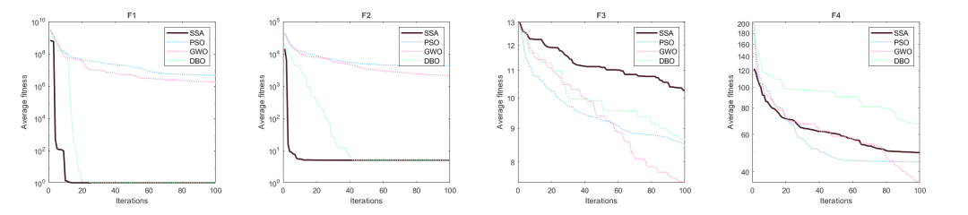 平均曲线收敛图的绘制中,对需要突出的算法设置了实线,对其他的对比算法设置为虚线,突出改进算法的优势!