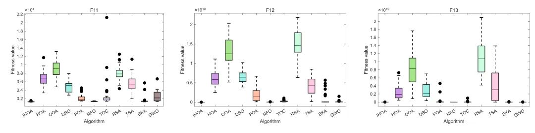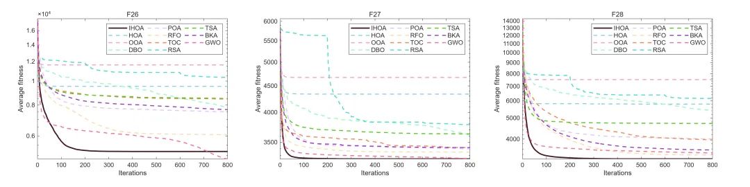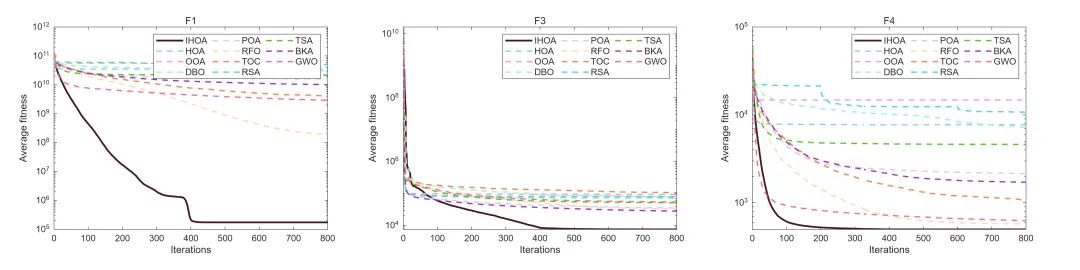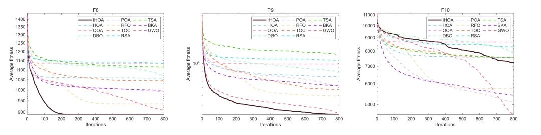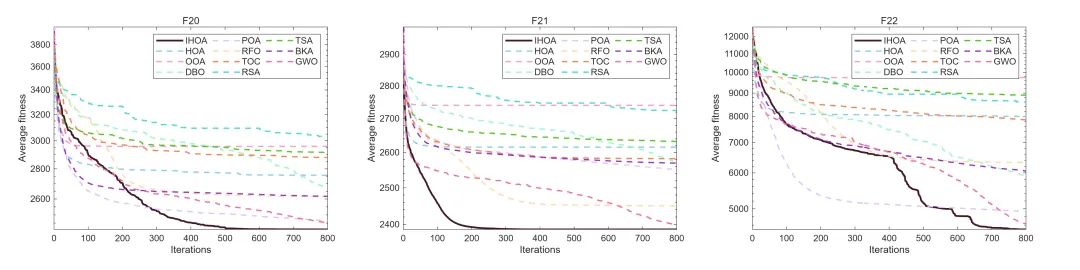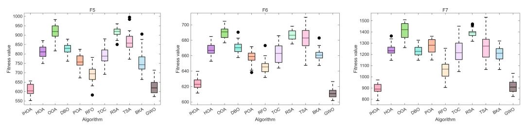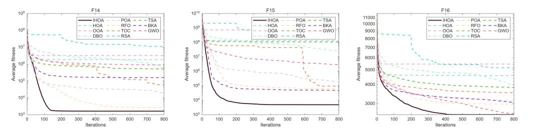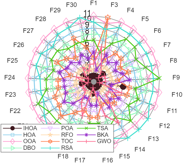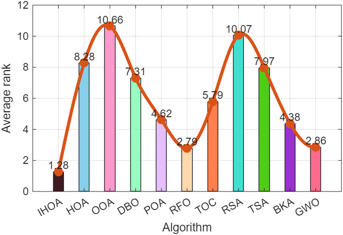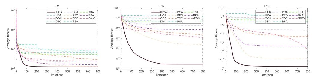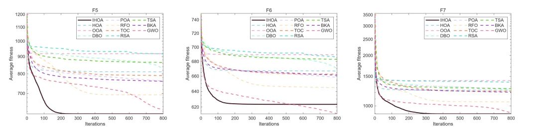 参与对比的算法有:改进的徒步优化算法与原始徒步优化算法(HOA),鱼鹰算法(OOA)、鹈鹕算法(POA)、蜣螂算法(DBO),吕佩尔狐优化(RFO)、龙卷风算法(TOC)、爬行搜索算法(RSA)、囊状虫群(TSA)、黑翅鸳算法(BKA)、灰狼算法(GWO)。