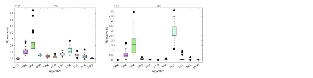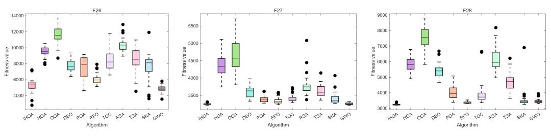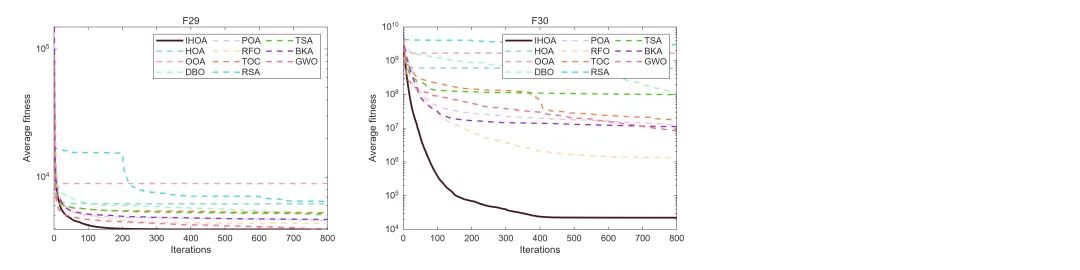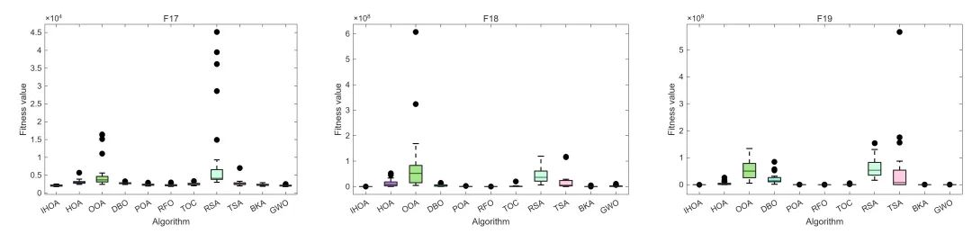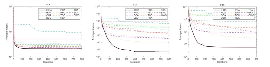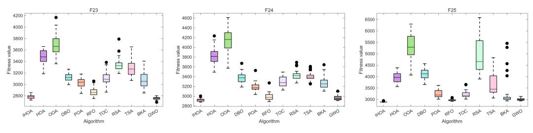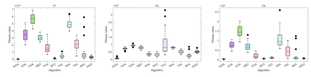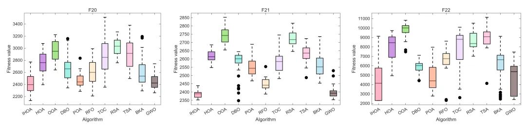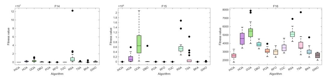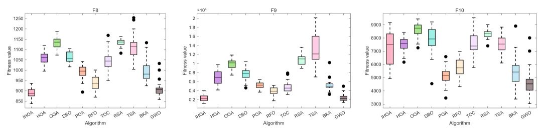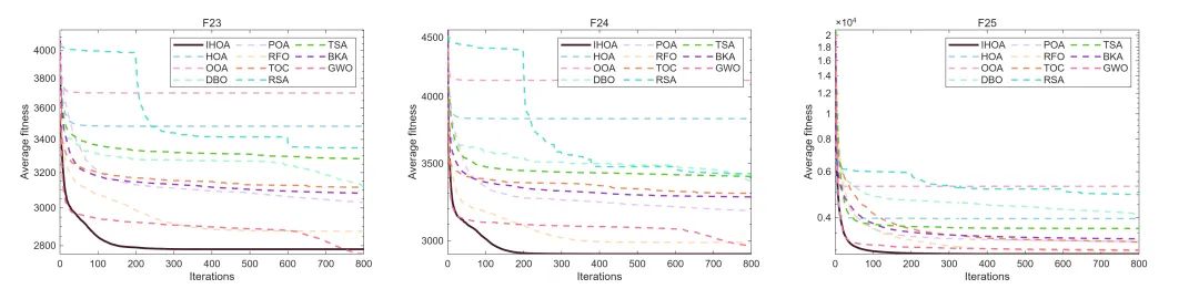 参与对比的算法有:改进的徒步优化算法与原始徒步优化算法(HOA),鱼鹰算法(OOA)、鹈鹕算法(POA)、蜣螂算法(DBO),吕佩尔狐优化(RFO)、龙卷风算法(TOC)、爬行搜索算法(RSA)、囊状虫群(TSA)、黑翅鸳算法(BKA)、灰狼算法(GWO)。