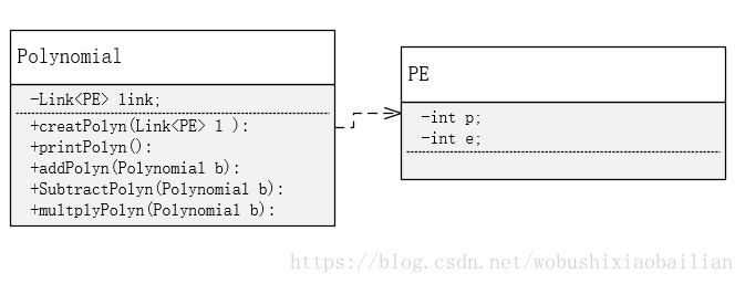 PE:是系数指数类,用于存储多项式每一项的系数和指数(分别为p,e)