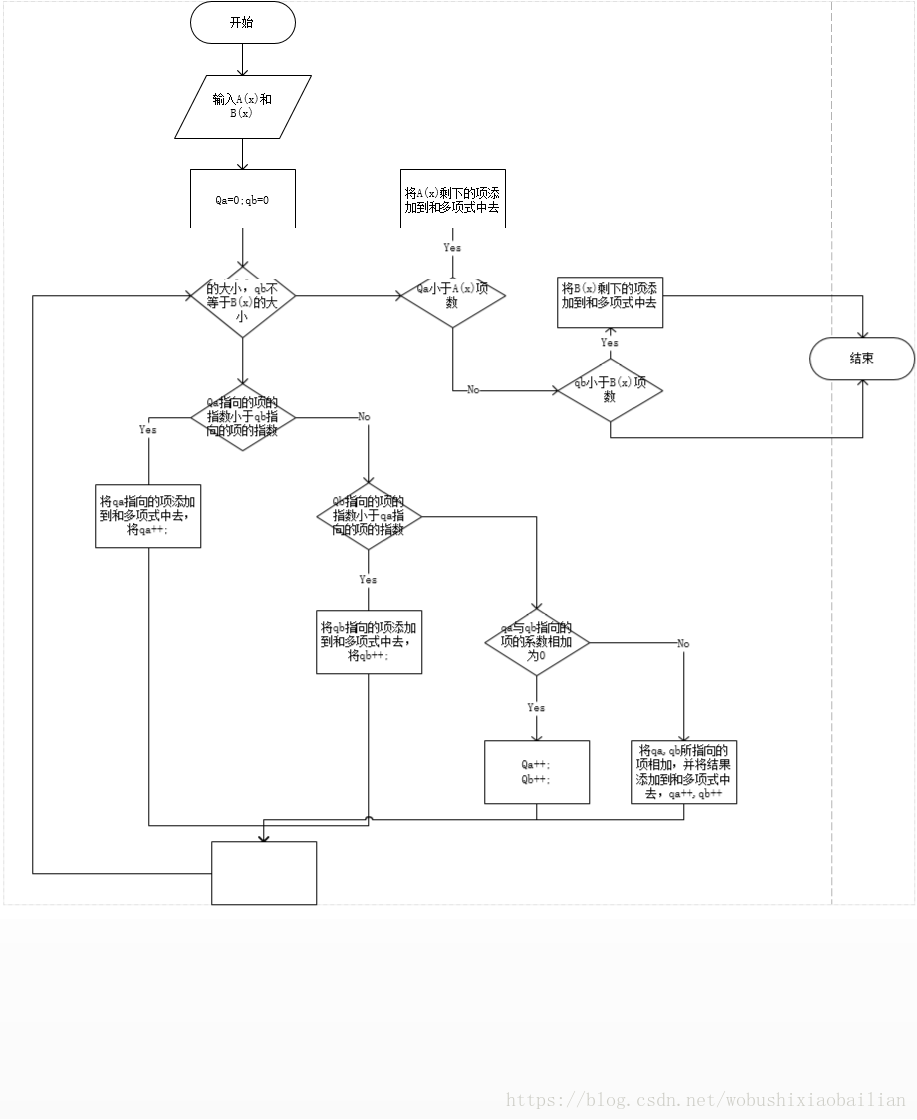 思路:假设指针qa和qb分别指向多项式A和多项式B中当前进行比较的某个节点,则比较两个节点中的指数项,有下面三种情况: