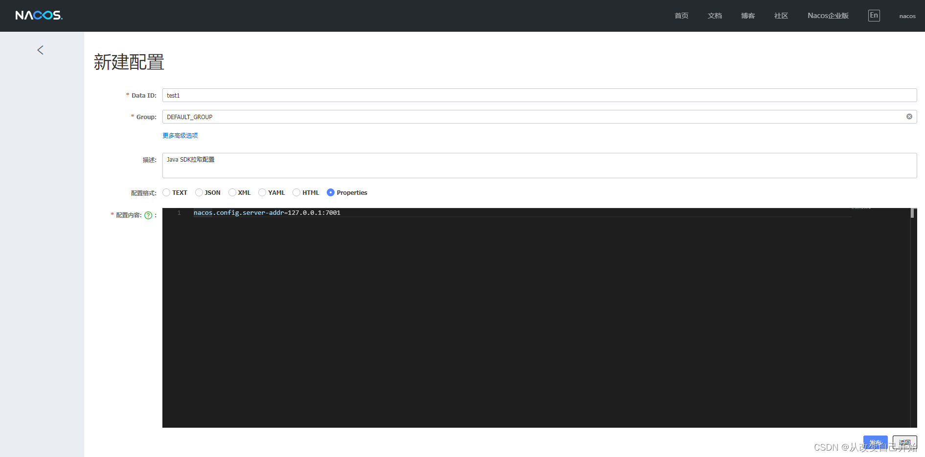 2、填写dataId和group并选择想要的配置文件格式后,输入自己想要配置的内容,如下: