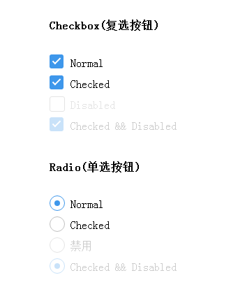 <div id="main"> <div class="demo"> <div class="col"> <h4>Checkbox(复选按钮)</h4> <div class="opt"> <input class="magic-checkbox" type="checkbox" name="layout" id="c1"> <label for="c1">Normal</label> </div> <div class="opt"> <input class="magic-checkbox" type="checkbox" name="layout" id="c2" checked> <label for="c2">Checked</label> </div> <div class="opt"> <input class="magic-checkbox" type="checkbox" name="layout" id="c3" value="option2" disabled> <label for="c3" style="color:#ccc">Disabled</label> </div> <div class="opt"> <input class="magic-checkbox" type="checkbox" name="layout" id="c4" checked disabled> <label for="c4" style="color:#ccc">Checked && Disabled</label> </div> </div> <div class="col"> <h4>Radio(单选按钮)</h4> <div class="opt"> <input class="magic-radio" type="radio" name="radio" id="r1" value="option1"> <label for="r1">Normal</label> </div> <div class="opt"> <input class="magic-radio" type="radio" name="radio" id="r2" value="option2" checked> <label for="r2">Checked</label> </div> <div class="opt"> <input class="magic-radio" type="radio" name="radio" id="r3" value="option3" disabled> <label for="r3" style="color:#ccc">禁用</label> </div> <div class="opt"> <input class="magic-radio" type="radio" id="r4" value="option4" checked disabled> <label for="r4" style="color:#ccc">Checked && Disabled</label> </div> </div> </div> </div>
