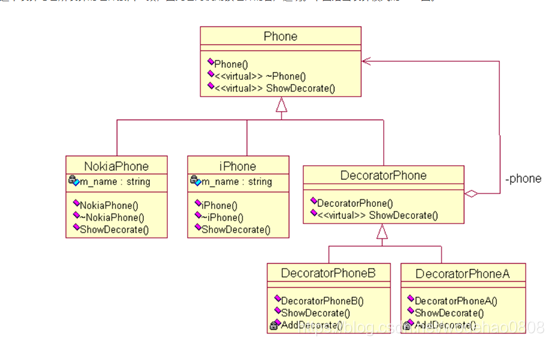在这种设计中,手机的装饰功能被独立出来,可以单独发展,进而简化了具体手机类的设计。下面给出Phone类的实现: