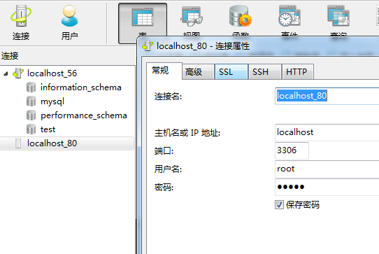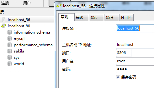 于是停掉80服务启动56服务,在Navicate中再次建立连接,成功。其间也出现了一些错误,最初出现的事3306端口被占用,于是在56版本的my.ini中修改了端口号,但是错误依旧,而且最终发现在my.ini中修改的端口号并不起作用,哪怕是去掉了前面的#注释符仍然不行,因为最后我在Navicata中用3306端口连接56成功时,56的my.ini中仍然是我改的3308。而且已经去掉了#注释服。期间还打开了windwos防火墙在入站规则中开启了3308端口,结果反而使得原本连接正常的80版无法连接,于是关闭了windows firewall的服务,80版连接恢复正常。总结原因可能是之前服务切换没有切换好,导致的56版无法连接。总之最后,两个版本都有3306端口成功连接Navicata。如图: