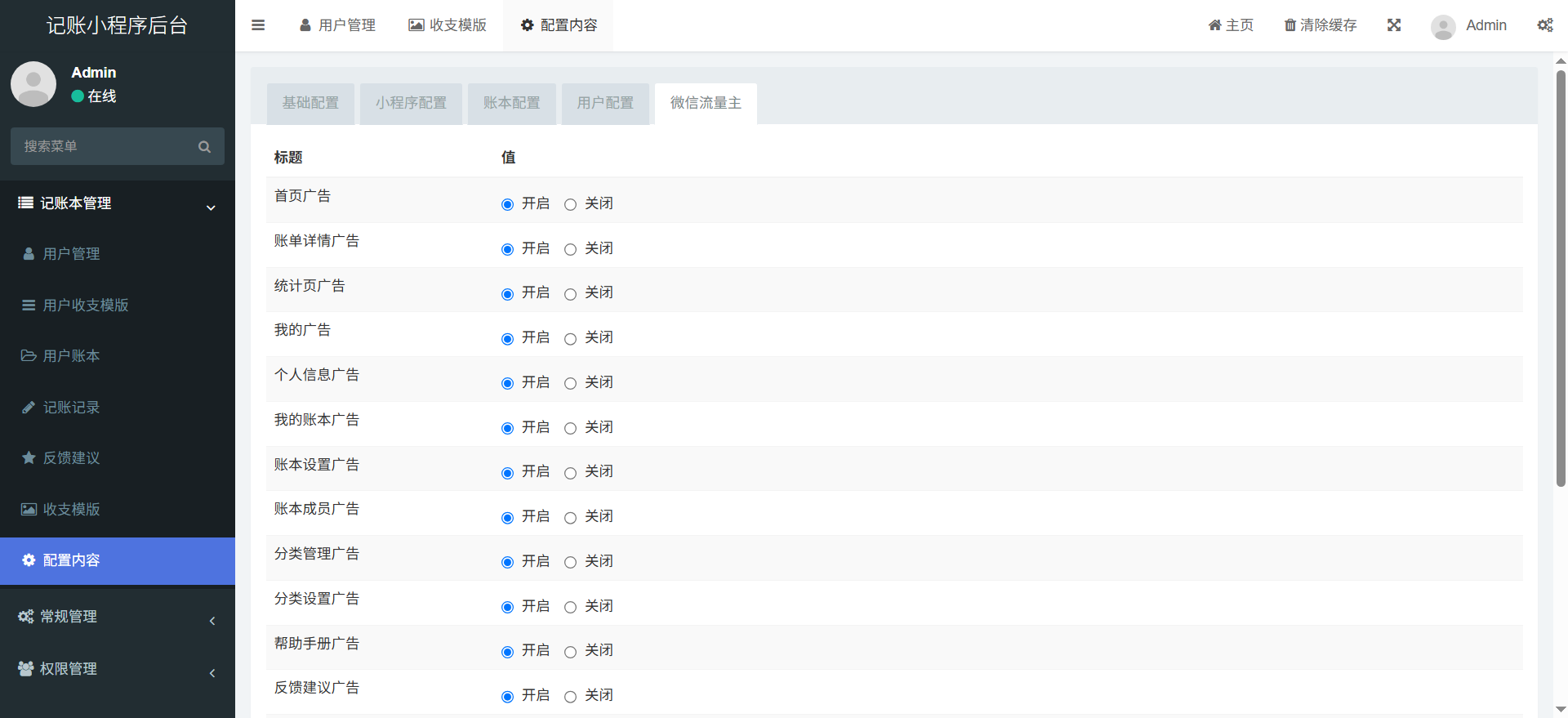 9、后台:流量主广告开关、小程序流量主广告显示/隐藏