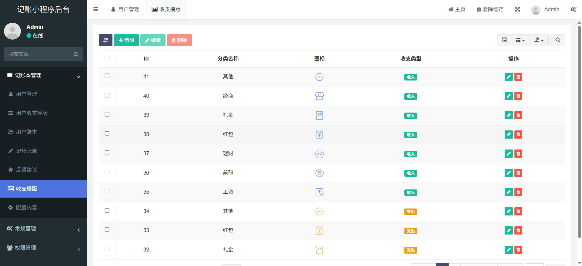 8、后台:用户管理、用户账本、用户收支分类、记账记录、收支模版、基本设置