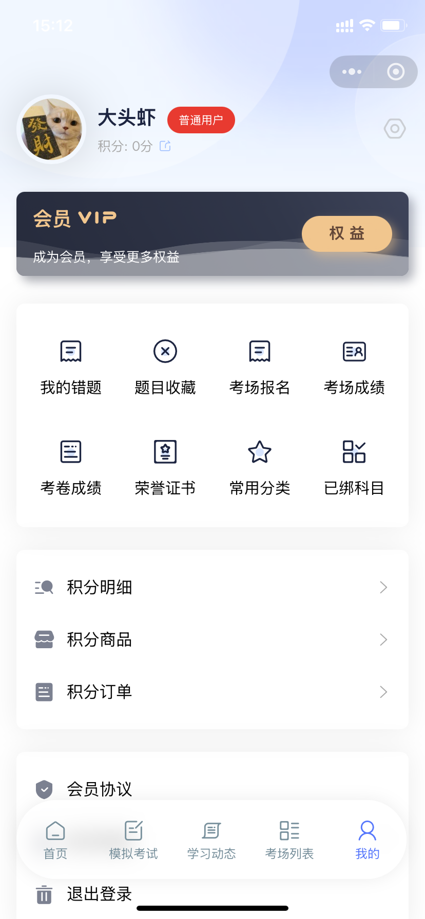 1、会员功能【开通会员,每日多渠道获积分,可免费考试或优惠考试费用】