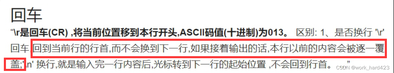 1. \r 回车并不会换行,回车表示回到当前行的行首,如上图。回车用\r表示。注意在printf这样的输出函数中用\r回车符,并且是连续输出,后来输出的内容会将之前的内容原地覆盖掉,这也解释了一些动态效果是如何实现的,如倒计时,或者旋转,这里用旋转举例。假设最初是 | ,后来输出 \ 并将 | 覆盖,后来又输出 / 将 \ 覆盖掉。