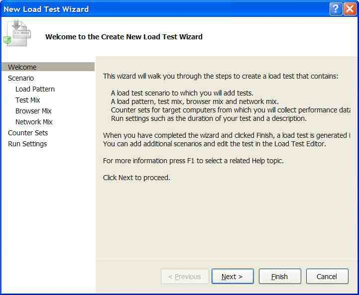 说一句题外话,飞机如何做压力测试?波音公司在早期是用沙袋或铅块压在飞机机翼上的不同部位,来模拟飞机在各种激烈运动中各个部位的受力,受力的上限一般是平常水平飞行受力的7倍。当然,现在的飞机设计公司都有一系列完备的模拟和测试工具(如风洞和计算机模拟工具等)。效能、负载、压力这些方面的测试会产生很多数据,这些数据最好保存在数据库中,以便于日后跟踪分析。这些数据将为以后做网站容量规划(CapacityPlanning,又称能力规划)提供重要的依据。在VSTS中,效能和压力测试都可以用"LoadTest"来实现,LoadTest牵涉到许多因素,因此我们需要按部就班地设置,如图 所示。