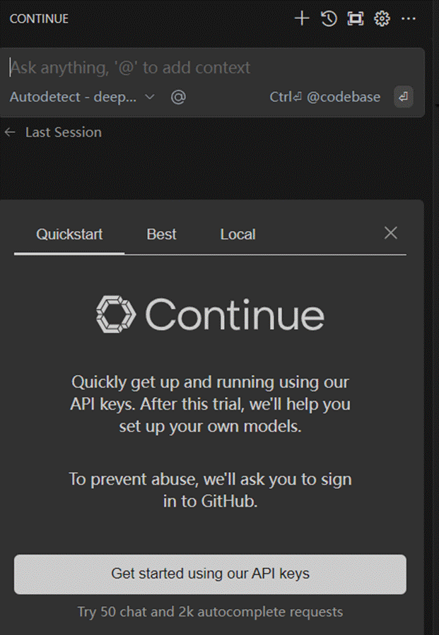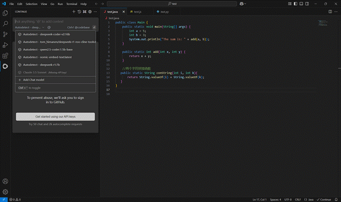 Continue插件:主要是一款基于AI代码补全和代码生成插件,旨在帮助开发者更高效编写代码。支持多种语言,包括Python、JavaScript、TypeScript、Rust等