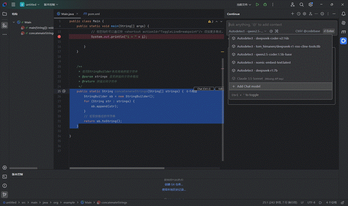 在@左侧下拉框点击一下,一般会插件自动检测加载Ollama,并展示已经安装的大模型,选择deepseek-coder-v2大模型(推荐,如果速度慢,可以选择deepseek-coder或者qwen2.5-coder),如果没有可以点击“+Add Chat Model”进行配置添加