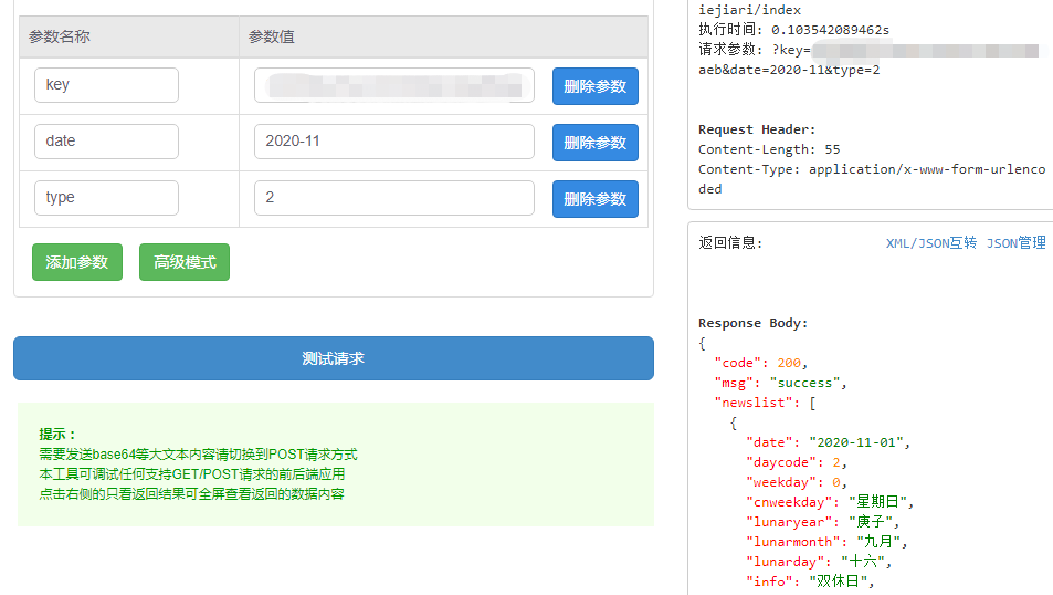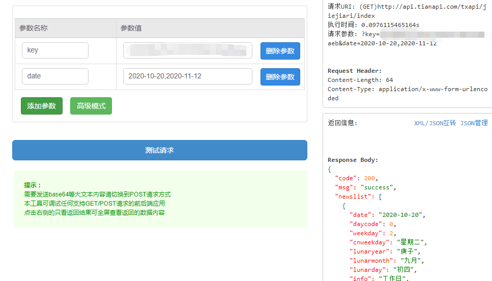批量查询日期信息时,date参数传递可以任意组合两个或多个日期,如2020-10-20,2020-11-12。此时接口会返回包含这两个时间的日期数组。