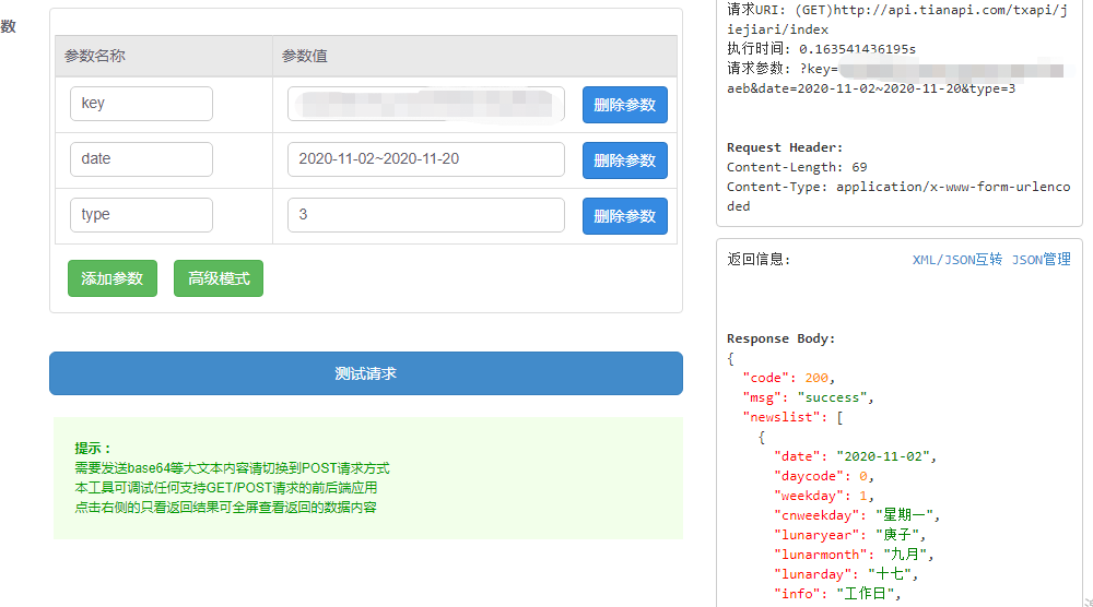 接口文档地址:节假日API接口 - 天行数据TianAPI