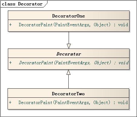 Decorator是装饰的抽象层虚基类。它实现一个DecoratorPaint方法来完成各种装饰任务,这个方法的设计是依据windows控件Control类型的绘制事件的响应函数原型来实现的,这样就可以把装饰类的方法直接挂接到控件的绘制事件。这一点从抽象层上保证了扩展性,也就是可以方便地扩展很多不同的特殊装饰效果出来,应用到windows控件。