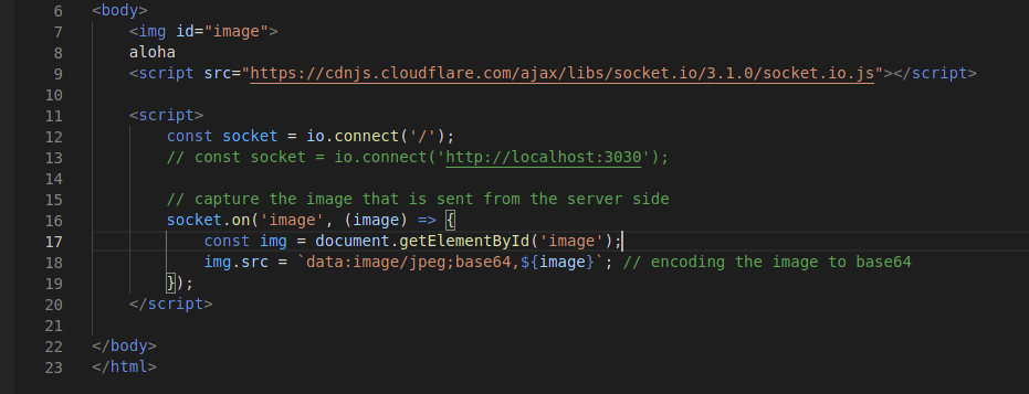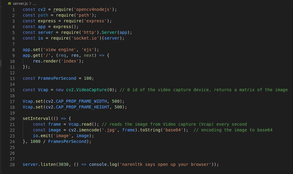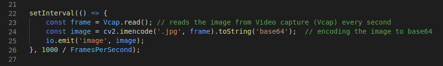 我们已经获得了视频捕获和编码的图像。我们之所以要编码,是因为所有被捕获的图像都是以矩阵格式读取的,这也是我们需要将它们编码为base64的主要原因,然后该字符串将通过万能的Socket IO进行广播。
