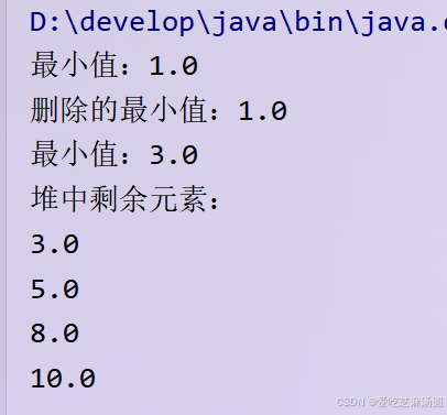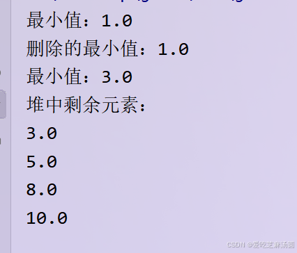 - System.out.println("最小值:" + heap.getMin()); // 3.0