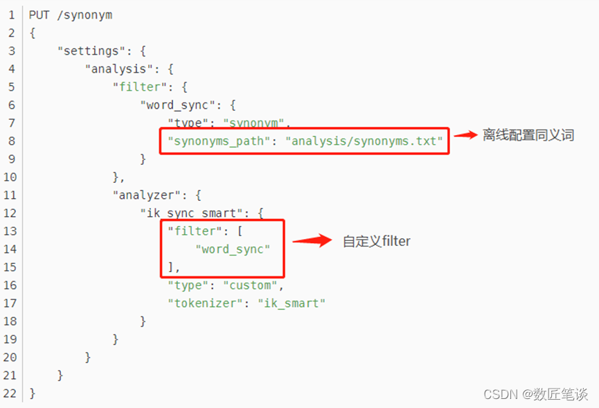 同义词查询的关键是自定义Token filter。该filter在收到Tokenizer发来的数据时,首先会获取synonym文件,比对Tokenizer处理后的词组,当出现同义词时,就按照synonym文件规则选定待搜索的词组,进行同义词搜索。ES在创建索引时进行预先设置同义词filter,并制定该filter为索引的Token filter,创建过程如下图所示: