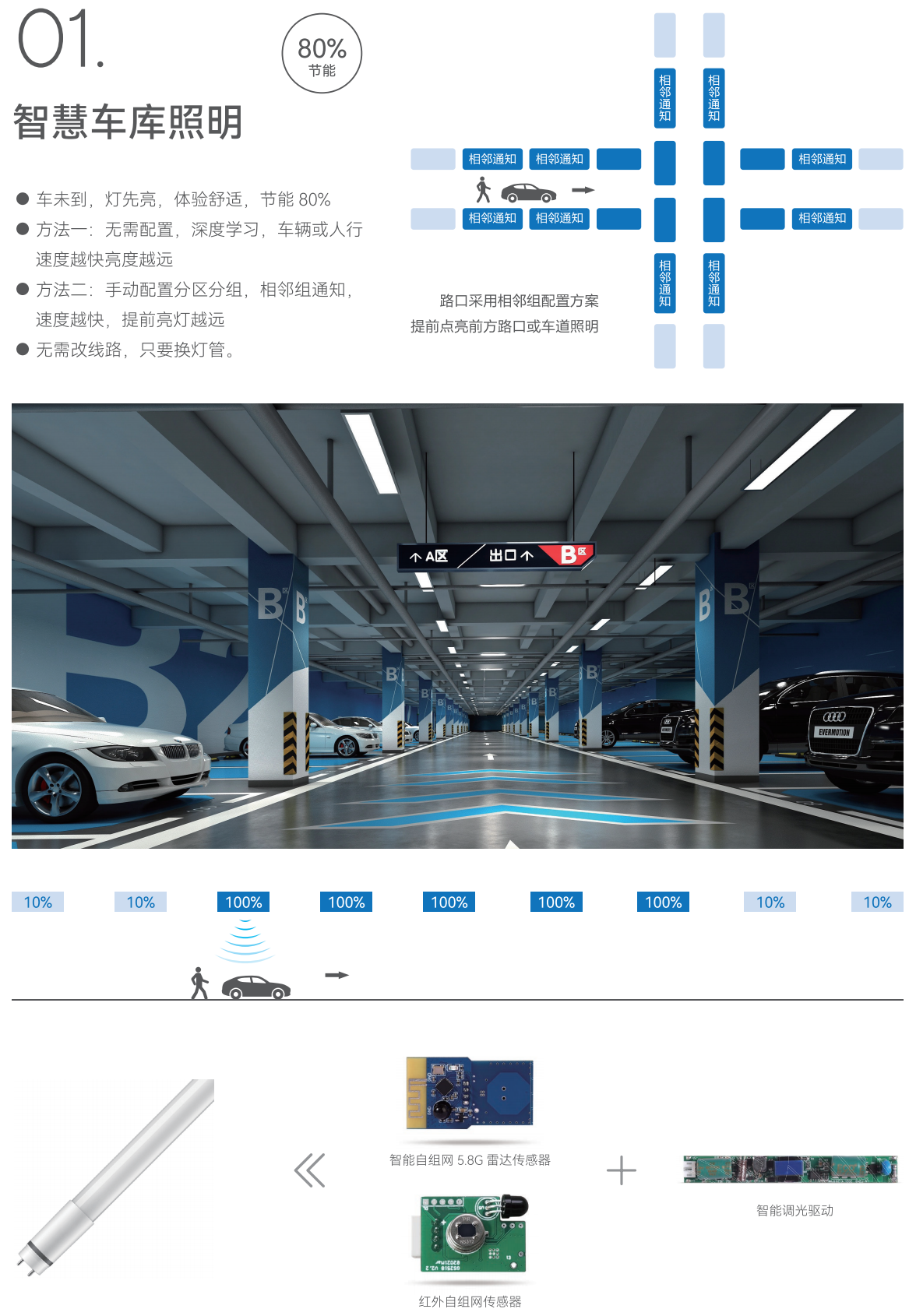 行为分析:北京朝外 SOHO 地下车库部署的物联网灯具,通过微波雷达识别车辆行进轨迹,实现 “车行全亮、人走微光” 模式,单灯功耗从 18W 降至 3W,节能率达 87%(无锡沃思智能)。