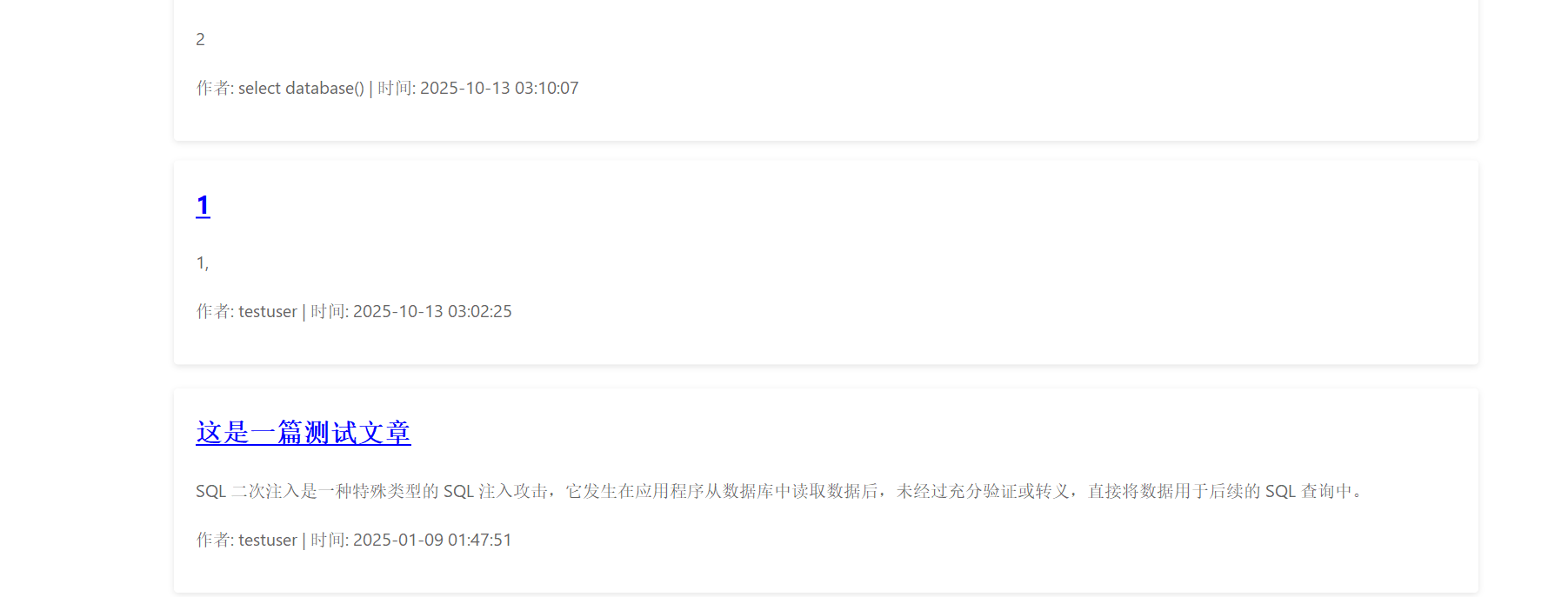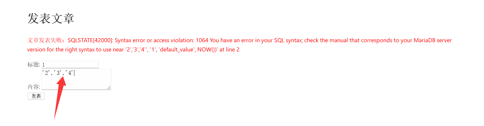 insert into (标题,内容,作者,隐藏字段,时间) values (‘1’,‘内容’,‘作者’,‘隐藏’,NOW())#',‘3’,‘4’,‘NOW()’)