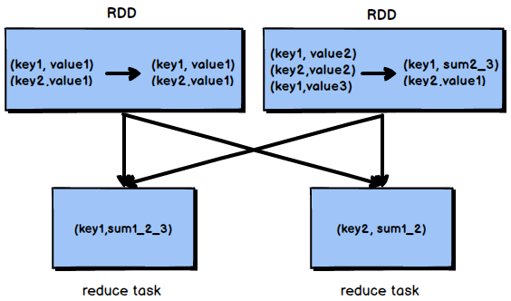 正常情况下,join 操作都会执行 shuffle 过程,并且执行的是 reduce join,也就是先将所有相同的 key 和对应的 value 汇聚到一个 reduce task(任务) 中,然后再进行join。普通 join 的过程如下图所示: