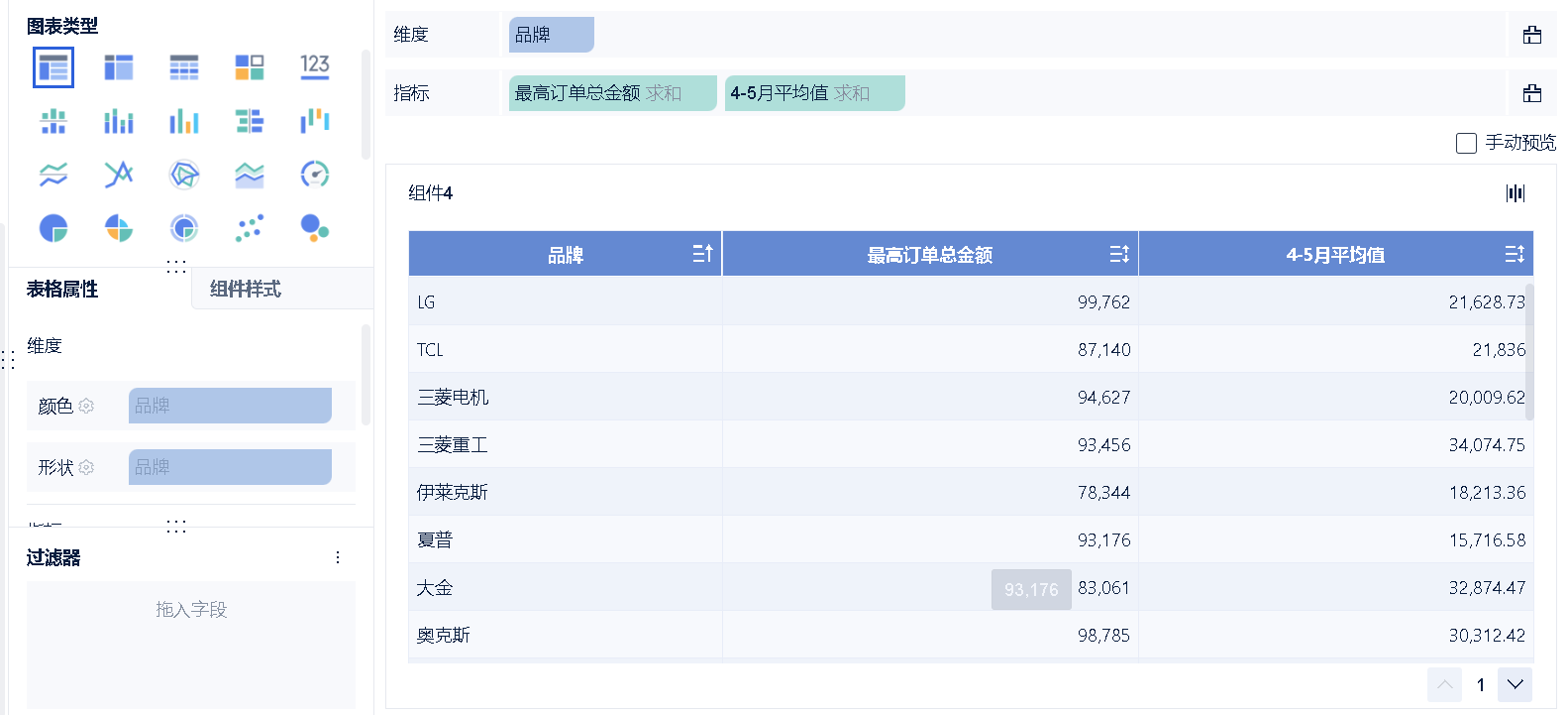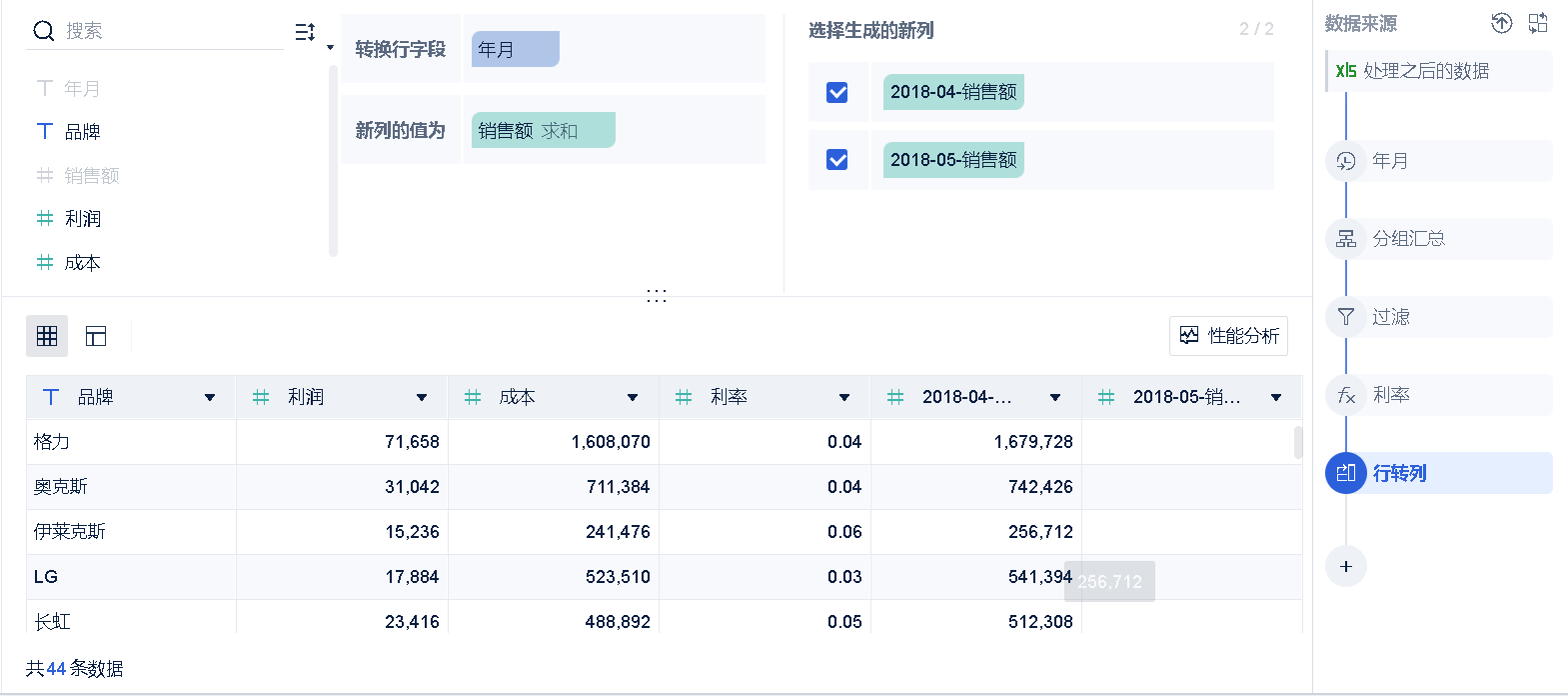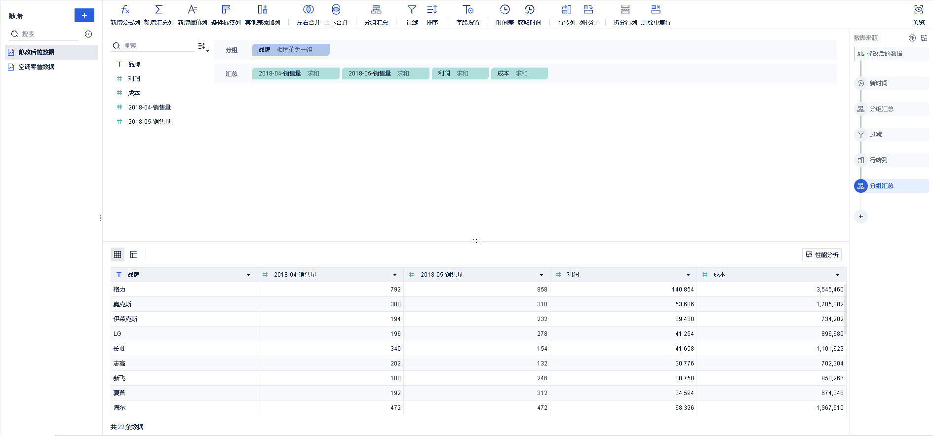 遇到了一个问题,一个品牌,4 月份有销售额,5 月份也有销售额,分为两条显示了。